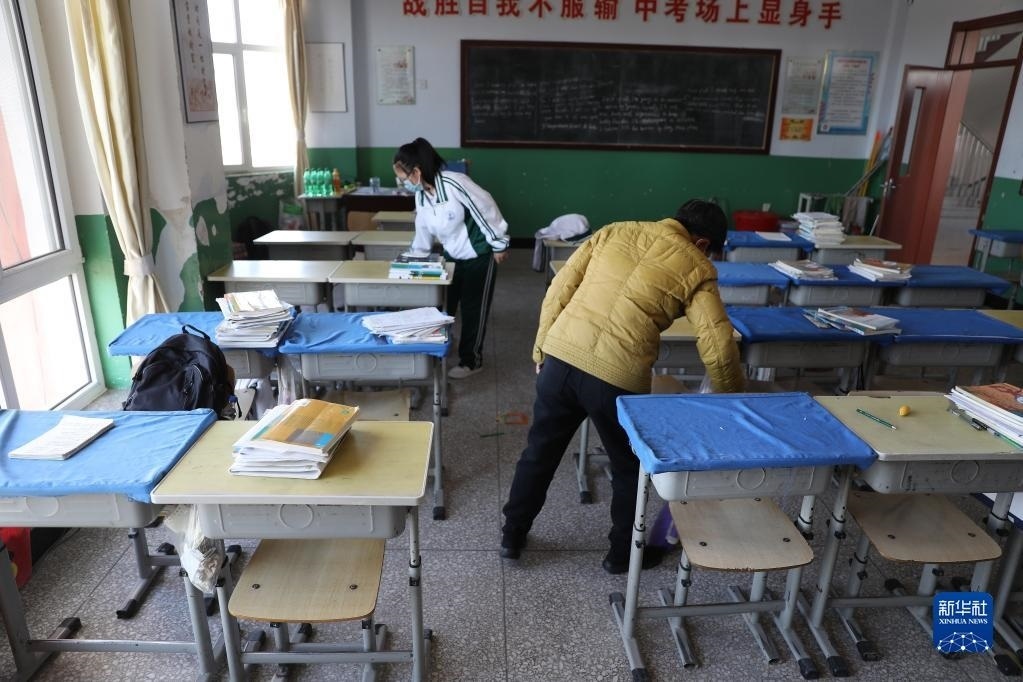 張連琴(左)和女兒李昕偉在教室內聽課(5月8日攝)。
