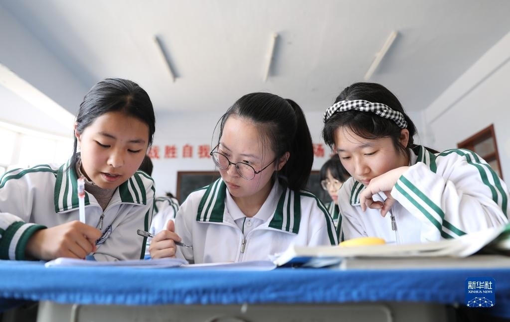 女兒李昕偉(中)課間和同學們交流習題,由于聽不太清,她需要目不轉睛地盯著同學的筆(5月8日攝)。