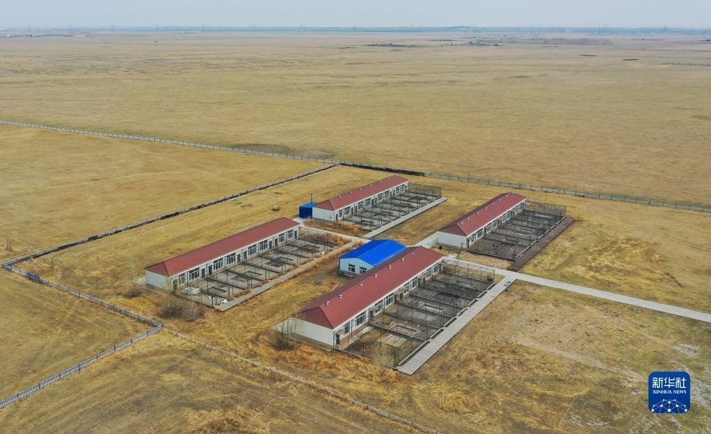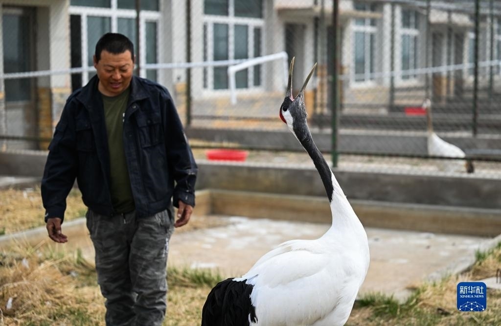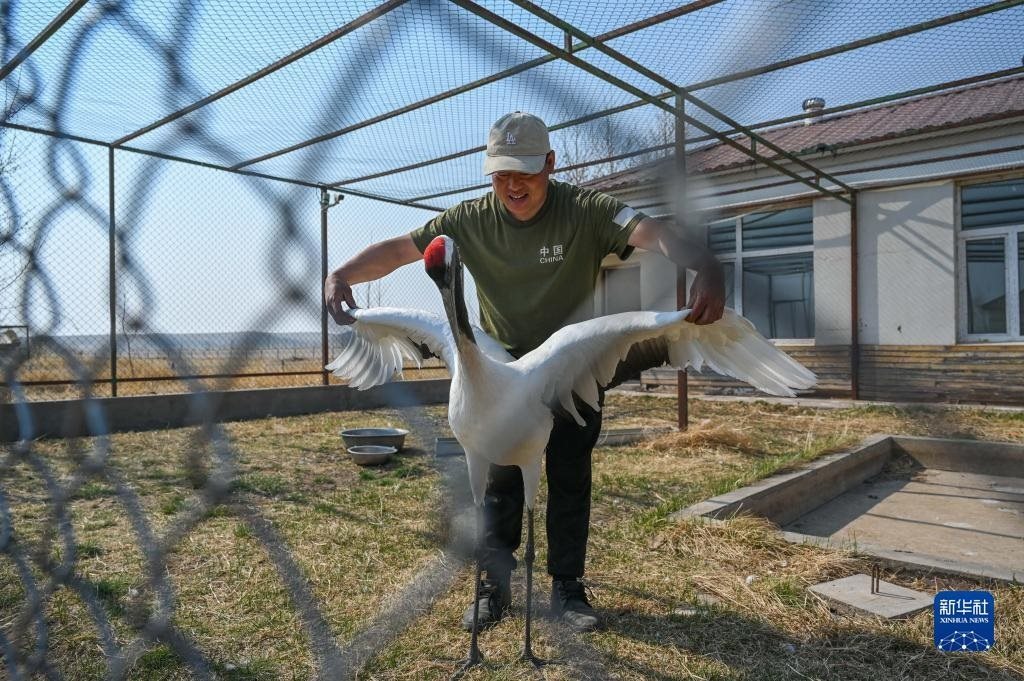 5月10日,徐沃德樂(lè)胡幫助一只救助的丹頂鶴張開翅膀。