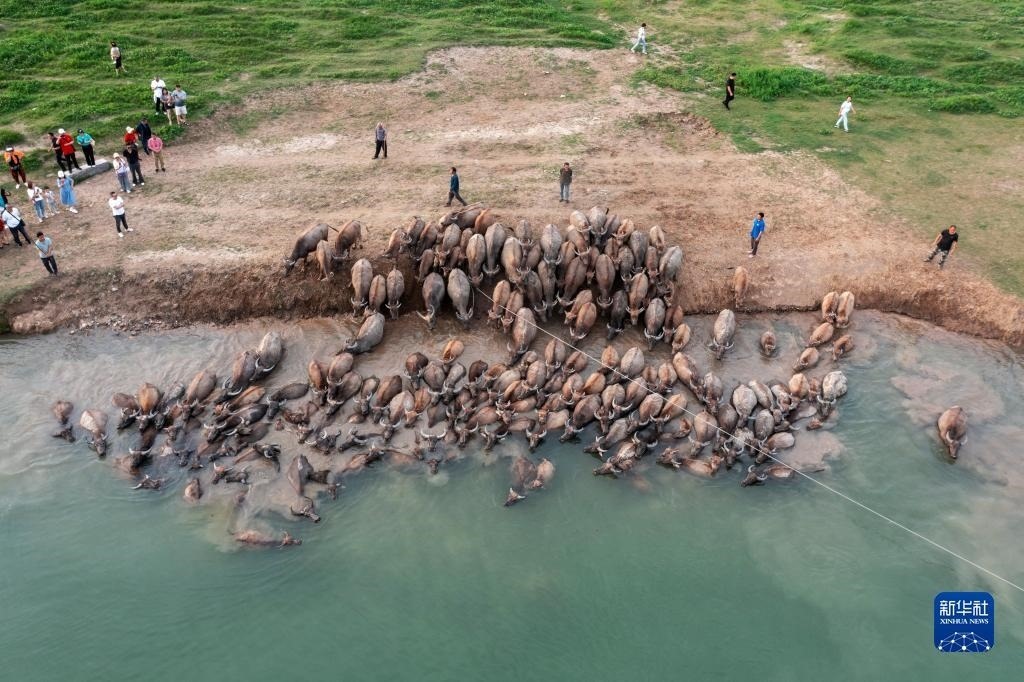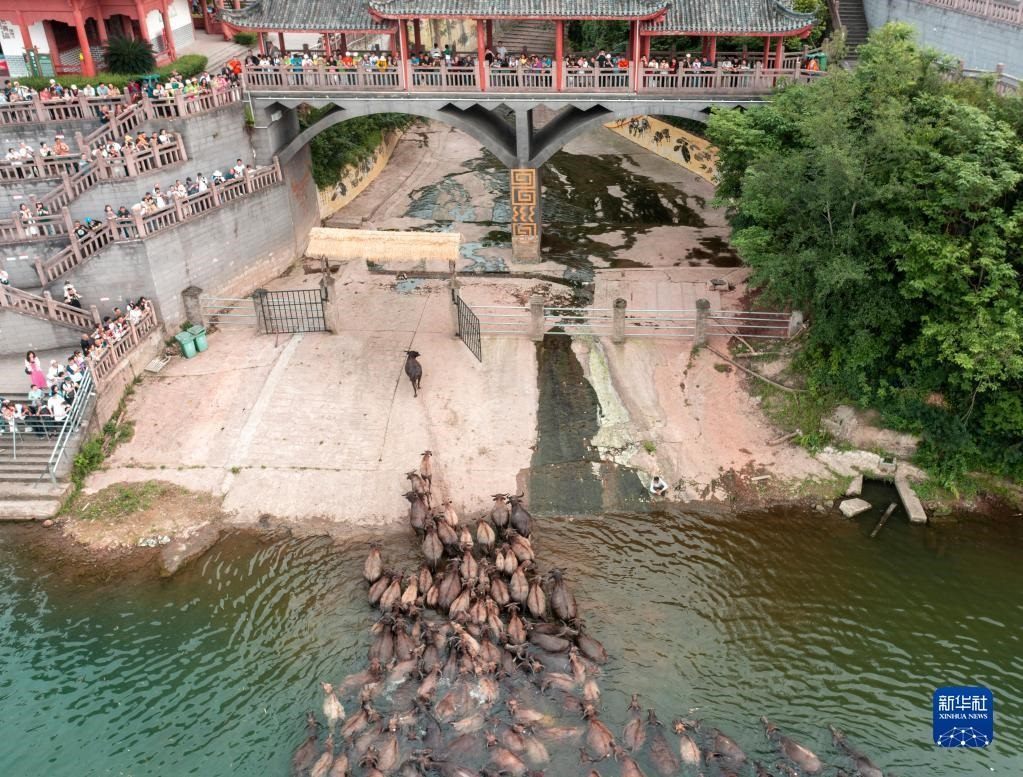 每年4-10月,在四川省南充市蓬安縣相如鎮(zhèn)油房溝村嘉陵江段,成群結隊的水牛在船只的護送引導下,清晨從岸邊結隊游上江心島啃食青草,黃昏又下水回游上岸歸欄,成為當?shù)匾坏廓毺氐木坝^,吸引不少游客前來觀看。
