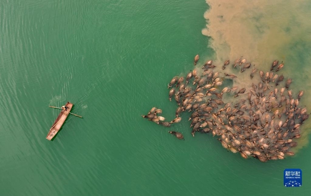 5月13日,在南充市蓬安縣相如鎮(zhèn)油房溝村嘉陵江段,成群結隊的水牛渡江(無人機照片)。