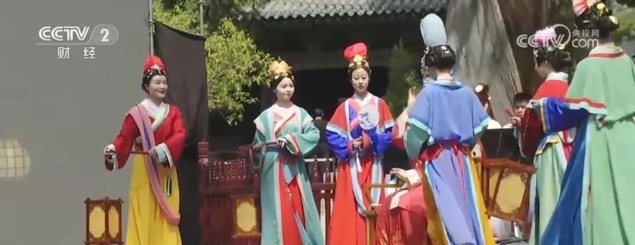 在晉祠的標(biāo)志性建筑圣母殿前,一場(chǎng)場(chǎng)穿越古今的表演登臺(tái)亮相。《晉祠十二時(shí)辰》由晉祠講解員自行編排而成,生動(dòng)還原了圣母殿內(nèi)人物的一天。從服飾裝扮到生活起居,她們用舞蹈讓雕塑“活”了起來(lái),也使游客從別樣的角度領(lǐng)略了圣母殿折射出的文化魅力。