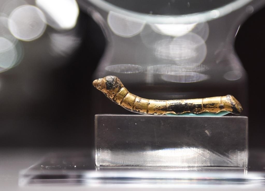 這條“鎏金銅蠶”1984年出土于陜西石泉縣,首尾共計(jì)9個腹節(jié),制作精致,造型逼真。新華社記者 羅曉光 攝