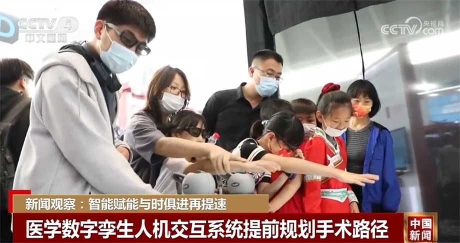 展會(huì)上,科研人員設(shè)計(jì)了一套基于全息現(xiàn)實(shí)的醫(yī)學(xué)數(shù)字孿生人機(jī)交互系統(tǒng),通過(guò)對(duì)患者數(shù)據(jù)進(jìn)行建模,在投影的孿生人上生成血管、器官等重要組織結(jié)構(gòu),輔助醫(yī)生進(jìn)行手術(shù)的路徑規(guī)劃。