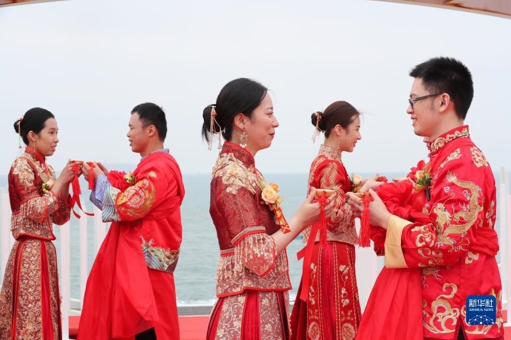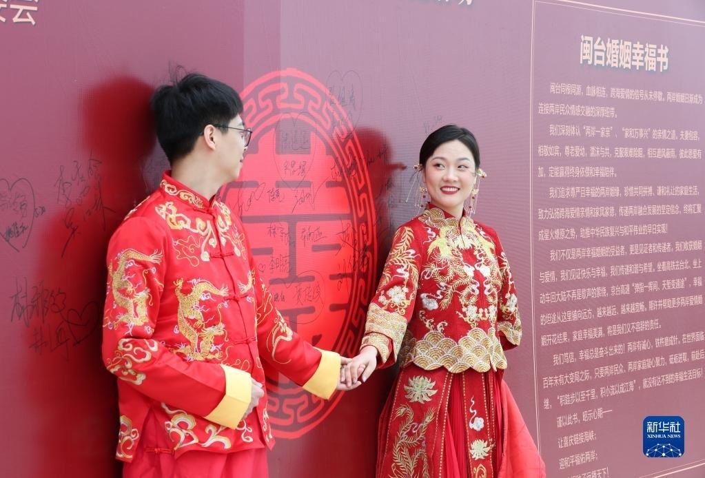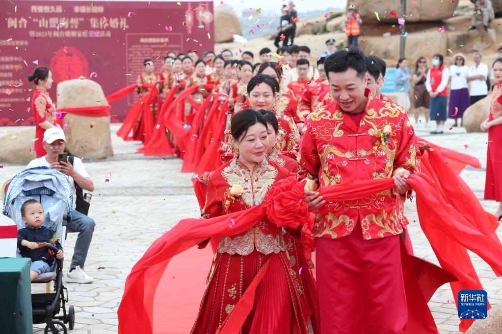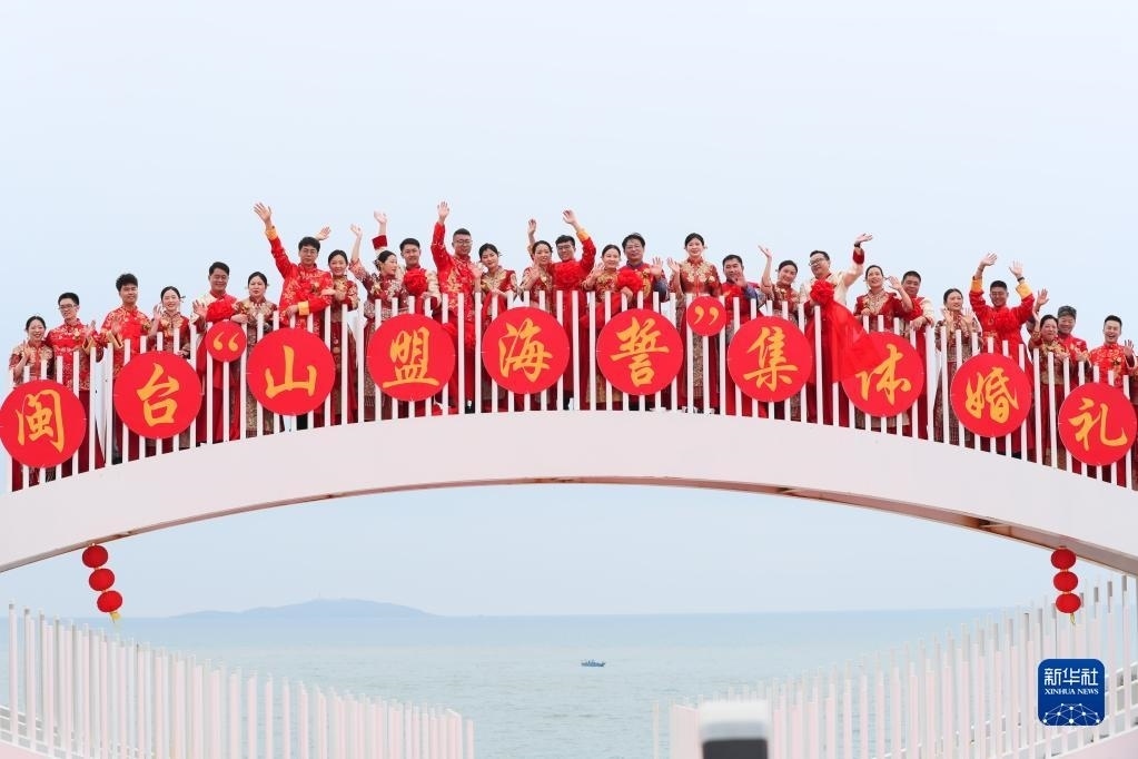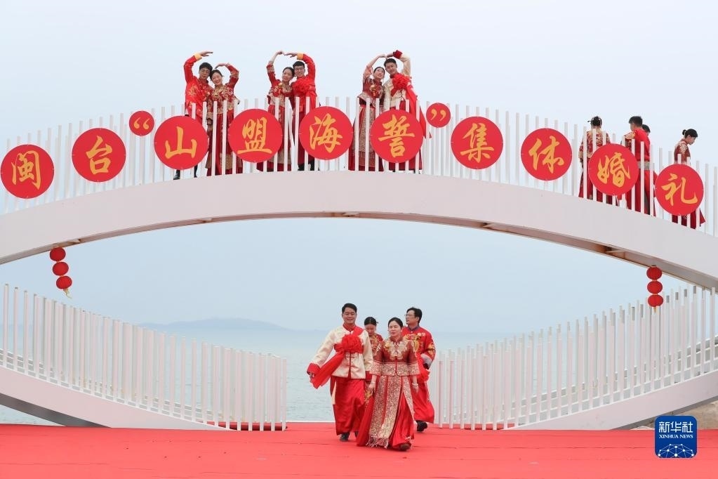 當(dāng)日,一場(chǎng)以“愛(ài)情恒久遠(yuǎn)、幸福長(zhǎng)相伴”為主題的閩臺(tái)“山盟海誓”集體婚禮暨2023年閩臺(tái)婚姻家庭交流活動(dòng)在福建省福州市平潭縣舉辦。21對(duì)閩臺(tái)新人身穿紅色中式婚服,手牽紅繡球,行跨火盆、踩瓦片、扎繡球和“合茶”、“合巹”、“海誓”等閩臺(tái)傳統(tǒng)結(jié)婚禮儀,結(jié)下跨越海峽的姻緣。