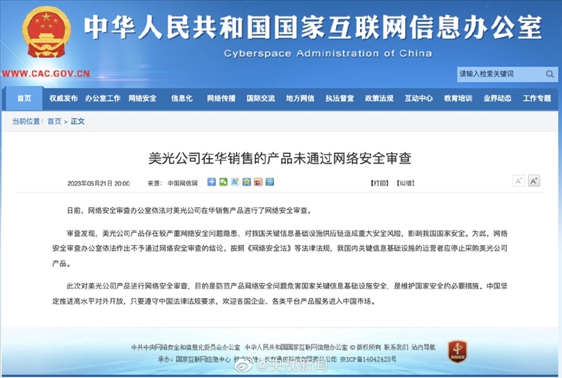 ·影響我國(guó)國(guó)家安全,美光公司在華銷售的產(chǎn)品未通過網(wǎng)絡(luò)安全審查。按照《網(wǎng)絡(luò)安全法》等法律法規(guī),我國(guó)內(nèi)關(guān)鍵信息基礎(chǔ)設(shè)施的運(yùn)營(yíng)者應(yīng)停止采購(gòu)美光公司產(chǎn)品。