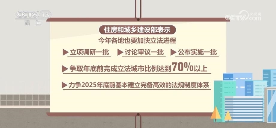 住房城鄉(xiāng)建設(shè)部表示,2023年,各地也要加快立法進程,立項調(diào)研一批、討論審議一批、公布實施一批,爭取年底前完成立法城市比例達(dá)到70%以上,力爭2025年底前基本建立完備高效的法規(guī)制度體系。