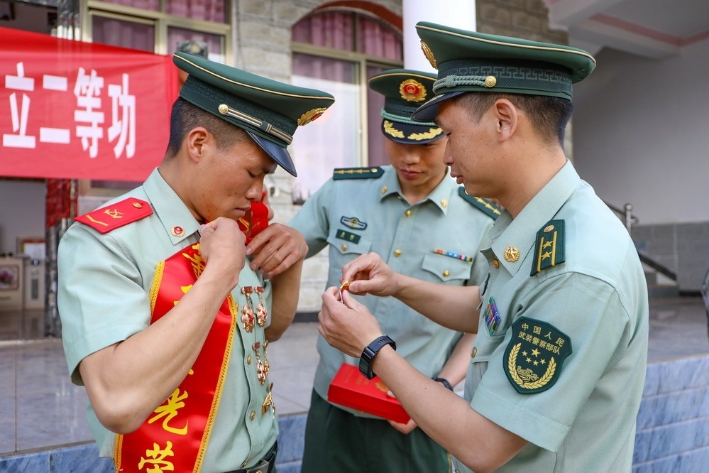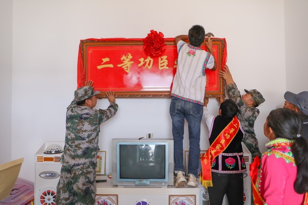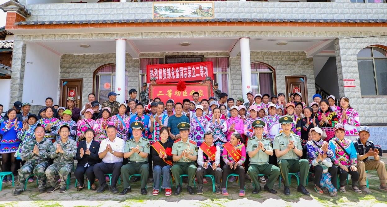 鑼鼓喧天,鞭炮齊鳴。近日,云南省楚雄彝族自治州大姚縣桂花鎮(zhèn)大河村張燈結(jié)彩、熱鬧非凡,武警云南總隊(duì)昭通支隊(duì)派出送喜報(bào)小分隊(duì)輾轉(zhuǎn)600余公里來(lái)到這里,聯(lián)合當(dāng)?shù)厝宋洳亢屯艘圮娙耸聞?wù)局,為榮立個(gè)人二等功的現(xiàn)役軍人鄒永金的家屬送去喜報(bào)、牌匾和慰問(wèn)金。