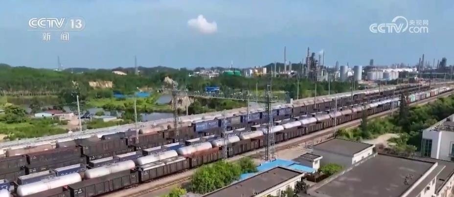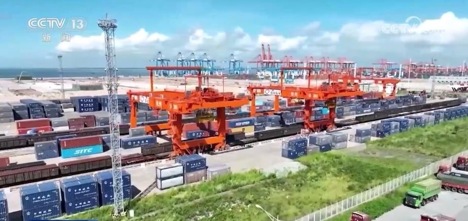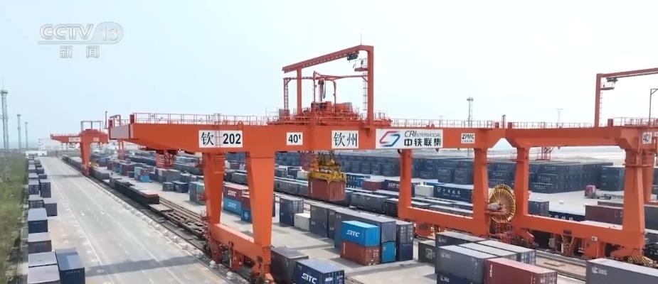在西部陸海新通道關(guān)鍵節(jié)點(diǎn)的欽州港東站,鐵海聯(lián)運(yùn)貨物上下列車(chē)、進(jìn)出港口24小時(shí)不停歇,每天最多到發(fā)的鐵海聯(lián)運(yùn)班列有21列。截至目前,西部陸海新通道鐵海聯(lián)運(yùn)班列已輻射我國(guó)17省份、60市、115個(gè)車(chē)站,通達(dá)全球119個(gè)國(guó)家和地區(qū)的393個(gè)港口。