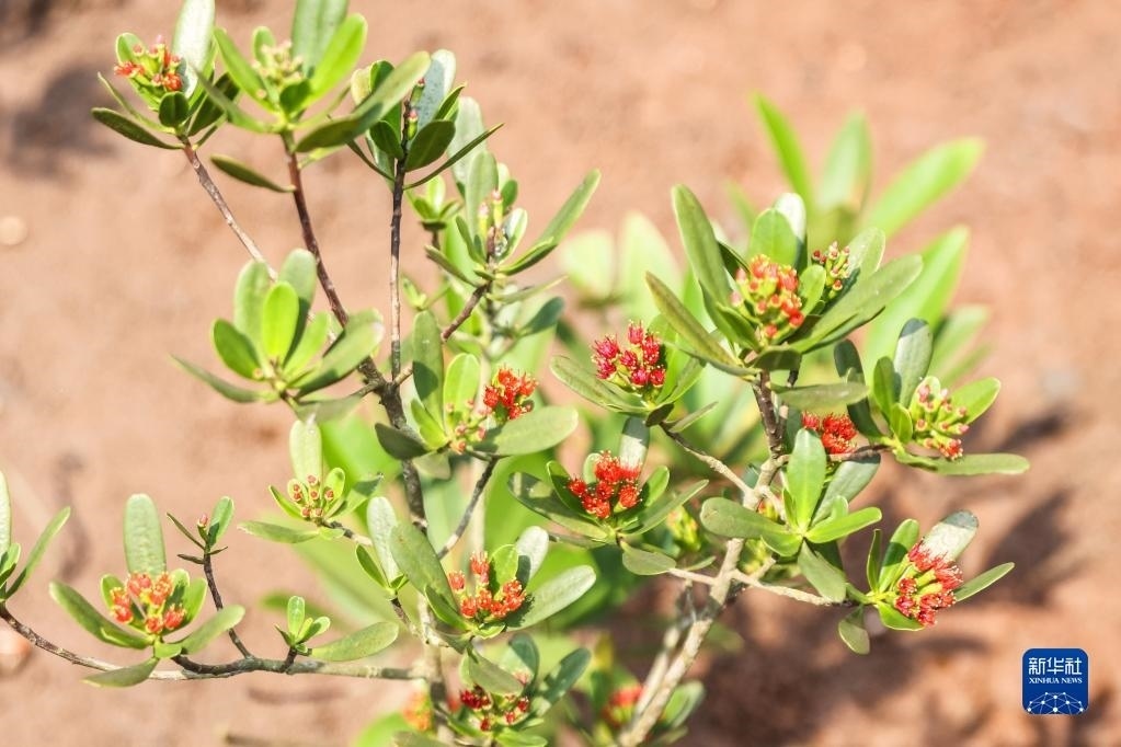 近日,在海南東寨港國家級(jí)自然保護(hù)區(qū)里的瀕危紅樹植物紅欖李迎來花期。據(jù)悉,紅欖李是珍稀瀕危紅樹植物、國家一級(jí)保護(hù)植物,被譽(yù)為紅樹林中的“大熊貓”。國內(nèi)一度僅存14株。2014年,海南東寨港國家級(jí)自然保護(hù)區(qū)管理局成功培育出紅欖李幼苗,并建立紅欖李野外種植基地。如今這里已有超過20畝、約2300株的紅欖李。