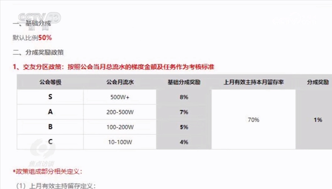 主播得到的打賞,平臺(tái)和經(jīng)紀(jì)機(jī)構(gòu)都會(huì)參與分成。一般來說,平臺(tái)要首先分走50%的打賞費(fèi)用,剩下的由主播和經(jīng)紀(jì)機(jī)構(gòu)來分。從某平臺(tái)與主播經(jīng)紀(jì)公司的后臺(tái)約定中可以看出,當(dāng)月總流水的梯度金額及任務(wù)作為考核。經(jīng)紀(jì)機(jī)構(gòu)月流水超過500萬元,至少可以額外拿到8%的獎(jiǎng)勵(lì)。在這種制度的激勵(lì)下,就推動(dòng)經(jīng)紀(jì)公司和主播想方設(shè)法爭取更高額度的打賞。