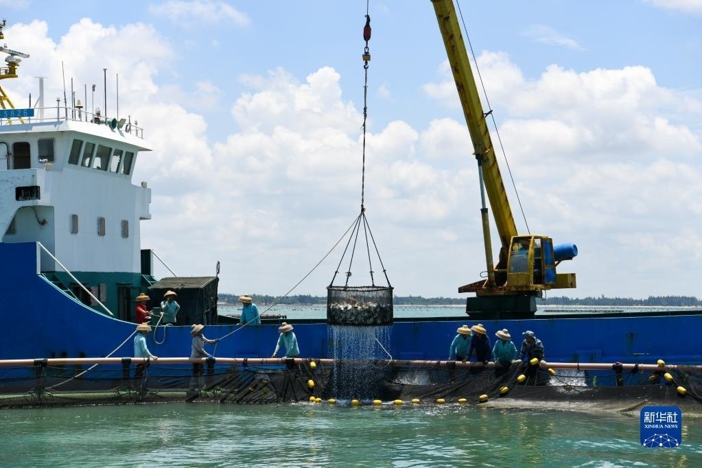5月27日,在湛江市徐聞縣西連鎮(zhèn),漁業(yè)工人在深海網(wǎng)箱拉網(wǎng)收獲金鯧魚(yú)。