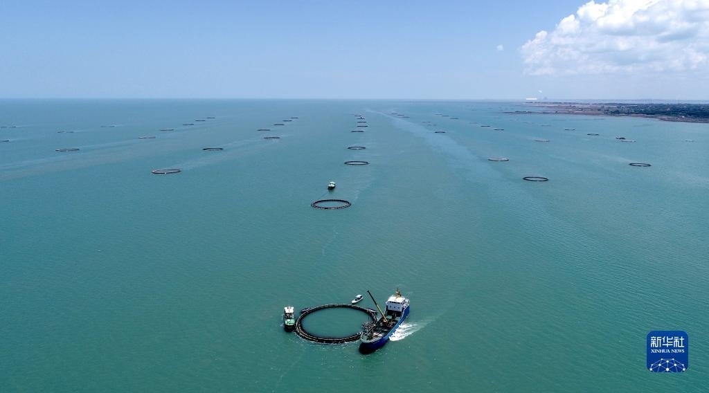 5月27日,在湛江市徐聞縣西連鎮(zhèn),漁業(yè)工人從徐聞國(guó)橋深海養(yǎng)殖有限公司的金鯧魚(yú)深海網(wǎng)箱捕魚(yú)(無(wú)人機(jī)照片)。