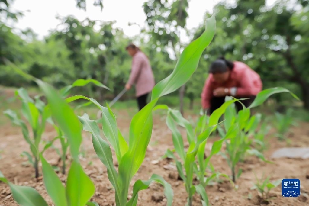 5月25日,在河北省遷西縣太平寨鎮(zhèn)馮莊村,農(nóng)民在管護(hù)栗樹林套種的玉米。