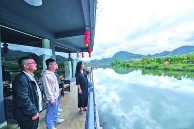 在浙江杭州臨安區(qū)昌化鎮(zhèn)白牛村,村落景區(qū)投資運營商羅星玥(右一)向游客介紹白牛村的自然風(fēng)光。新華社發(fā)
