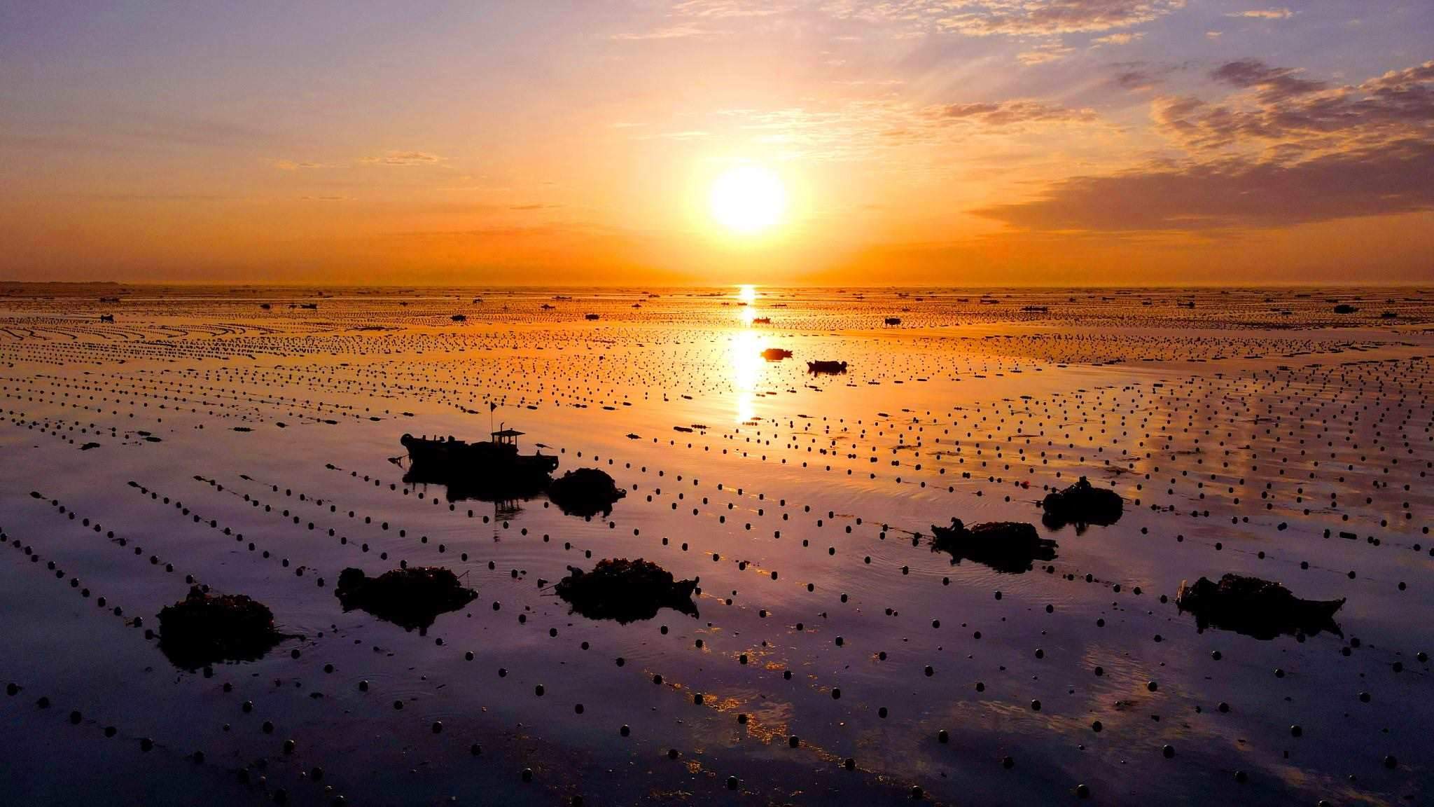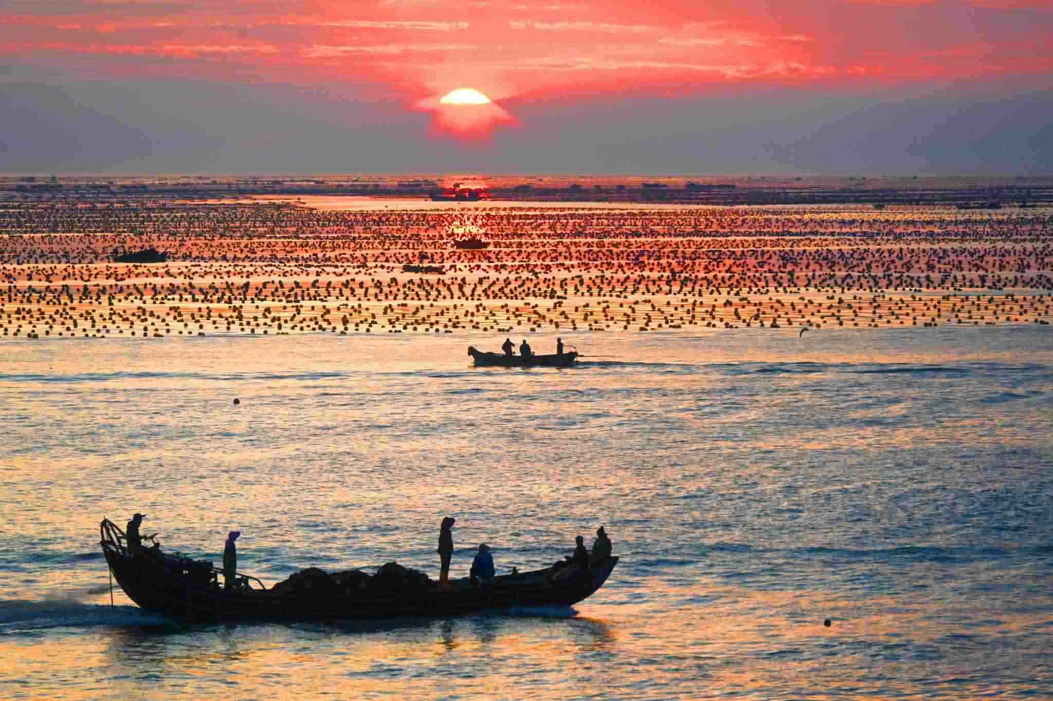 2023年5月31日,山東威海,榮成愛倫灣海洋牧場,漁民駕駛船只在海上收獲海帶,美麗的朝霞倒影在海上,海鷗伴舞,海洋牧場到處呈現(xiàn)一派豐收的喜人景象。視覺中國