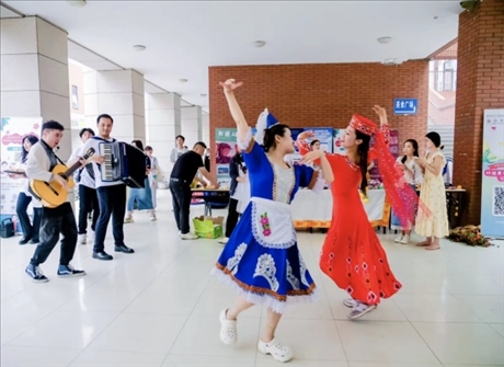 5月31日,“石榴籽 祖國行”新疆大學(xué)代表團(tuán)來到南開大學(xué)。在故事分享會上,王彥臣、李姝洋、迪力亞爾·迪力夏提同學(xué)向南開大學(xué)青年學(xué)子講述了“斷臂男孩”阿卜杜外力·阿卜杜拉、“黨徽大叔”阿布都加帕爾·猛德和“時代楷模”拉齊尼·巴依卡的故事。在文藝大舞臺上,新疆大學(xué)代表團(tuán)各民族同學(xué)通過展示新疆特色舞蹈“木卡姆”、民族器樂“庫布孜”,向南開大學(xué)師生展現(xiàn)大美新疆熱情好客、能歌善舞的地域特色。