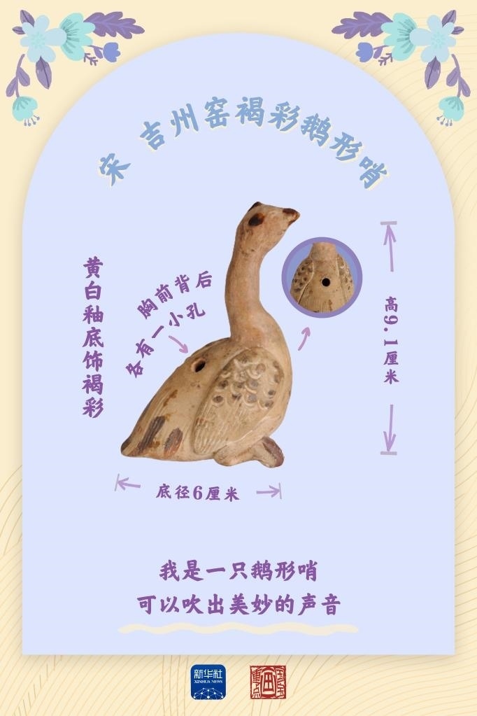 鵝形哨出土于江西吉安的宋代吉州窯遺址。吉安市博物館館長(zhǎng)李希朗說,吉州窯的瓷土粗松,有近似于陶的特點(diǎn),可塑性較強(qiáng)。這里出土的瓷塑大多不超過10厘米,動(dòng)物瓷塑的原型多為社會(huì)生活中所常見。從出土的瓷塑數(shù)量來看,吉州窯當(dāng)年的訂單量很大,頗受市場(chǎng)歡迎。也許每一只鵝形哨的背后,都有一名鼓著腮幫子的稚童。歷經(jīng)時(shí)光荏苒,鵝形哨到今天還能發(fā)出動(dòng)聽的哨音。