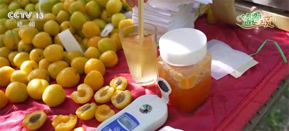 其實(shí)輪臺白杏在新疆本地也是非常有口碑的。大家知道嗎?輪臺白杏在當(dāng)?shù)匾脖环Q作是“白色蜂蜜”,那它到底擔(dān)不擔(dān)得起這個稱號?我們今天在現(xiàn)場給大家?guī)砹艘粋€小的試驗(yàn),這是一杯白水加了三勺蜂蜜,可以看到它已經(jīng)是蜂蜜水的顏色了,我們通過測糖儀來測一下蜂蜜水的糖度,17度。那我們來測一下我們剛才嘗的這個輪臺白杏,擠一些它的汁液出來,16度,已經(jīng)非常接近蜂蜜水的甜度了。