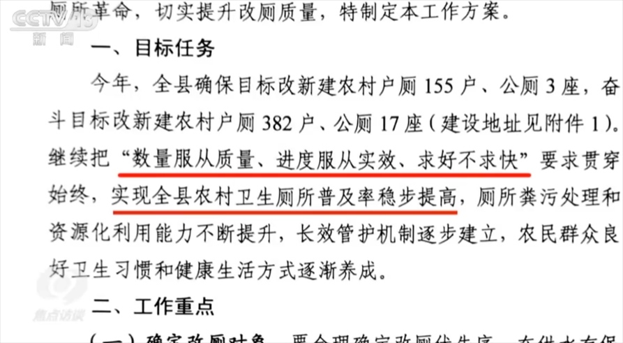 近年來,桂東縣持續(xù)加大廁改資金保障力度。政府切實投入了真金白銀,但在一些地方,廁改的成效卻打了水漂。記者拿到了《桂東縣2023年農(nóng)村“廁所革命”工作方案》,文中提出,繼續(xù)把“數(shù)量服從質(zhì)量、進度服從實效、求好不求快”要求貫穿始終,實現(xiàn)全縣農(nóng)村衛(wèi)生廁所普及率穩(wěn)步提高。