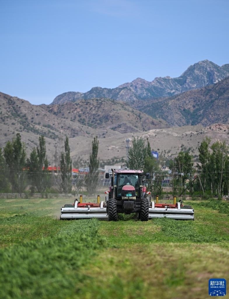 6月4日,在土默特左旗國(guó)家現(xiàn)代農(nóng)業(yè)示范區(qū)內(nèi),機(jī)械車輛在收割苜蓿。
