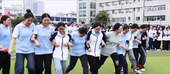 在四川廣漢中學(xué),一場(chǎng)專(zhuān)門(mén)針對(duì)高三學(xué)子的趣味接力賽正在開(kāi)展。同學(xué)們?cè)谕瓿少惻?、跳繩等項(xiàng)目的同時(shí),需要團(tuán)隊(duì)協(xié)作完成顛網(wǎng)球、射門(mén)等項(xiàng)目。