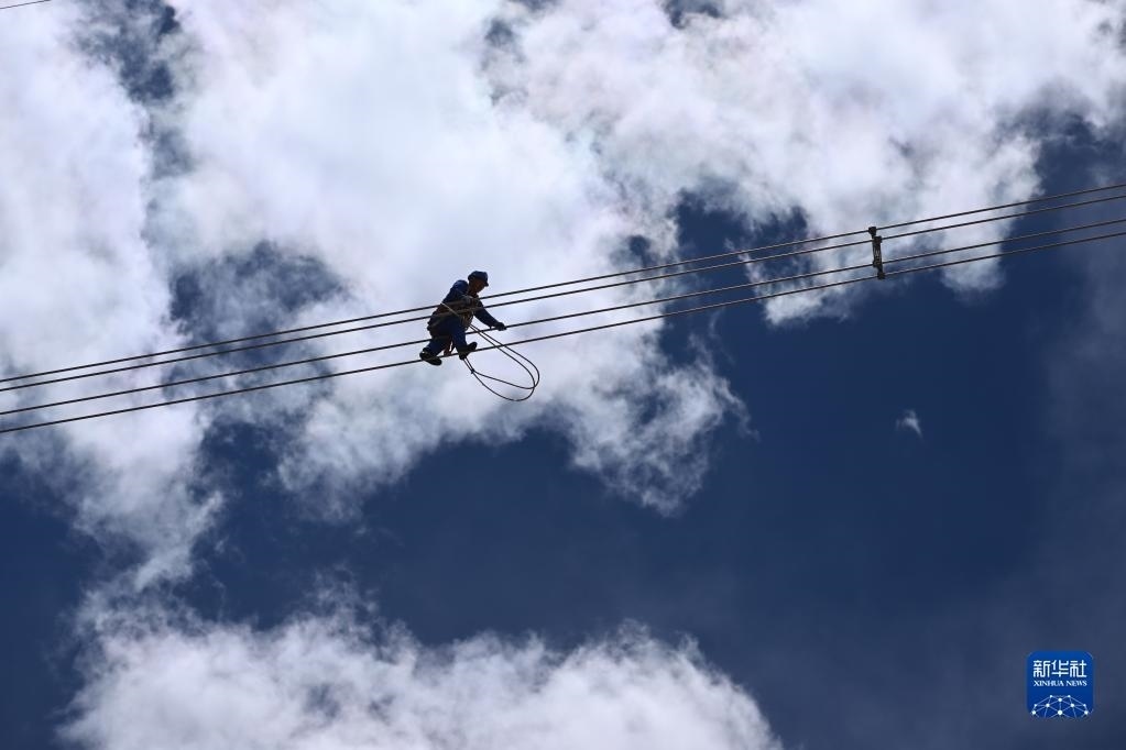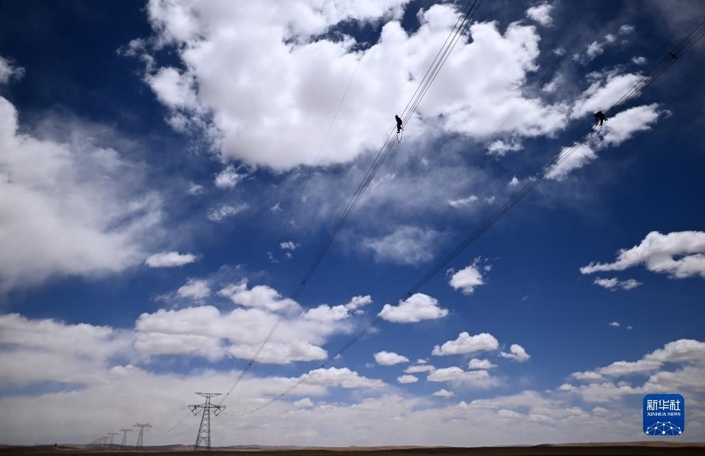 在青海省海西蒙古族藏族自治州格爾木市唐古拉山鎮(zhèn)境內(nèi),檢修人員在走線巡檢中(6月3日攝)。   新華社發(fā) (潘彬彬 攝)