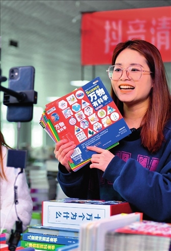廊坊市永清經(jīng)濟開發(fā)區(qū)京聯(lián)集團館配圖書聯(lián)合現(xiàn)采基地,工作人員在電商平臺直播銷售圖書(2023年3月26日攝)。駱學峰攝/本刊