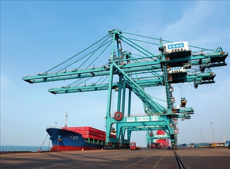 船舶??吭诤颖秉S驊港綜合港區(qū)集裝箱碼頭進行卸船作業(yè)(2023年3月9日攝)。駱學峰攝/本刊