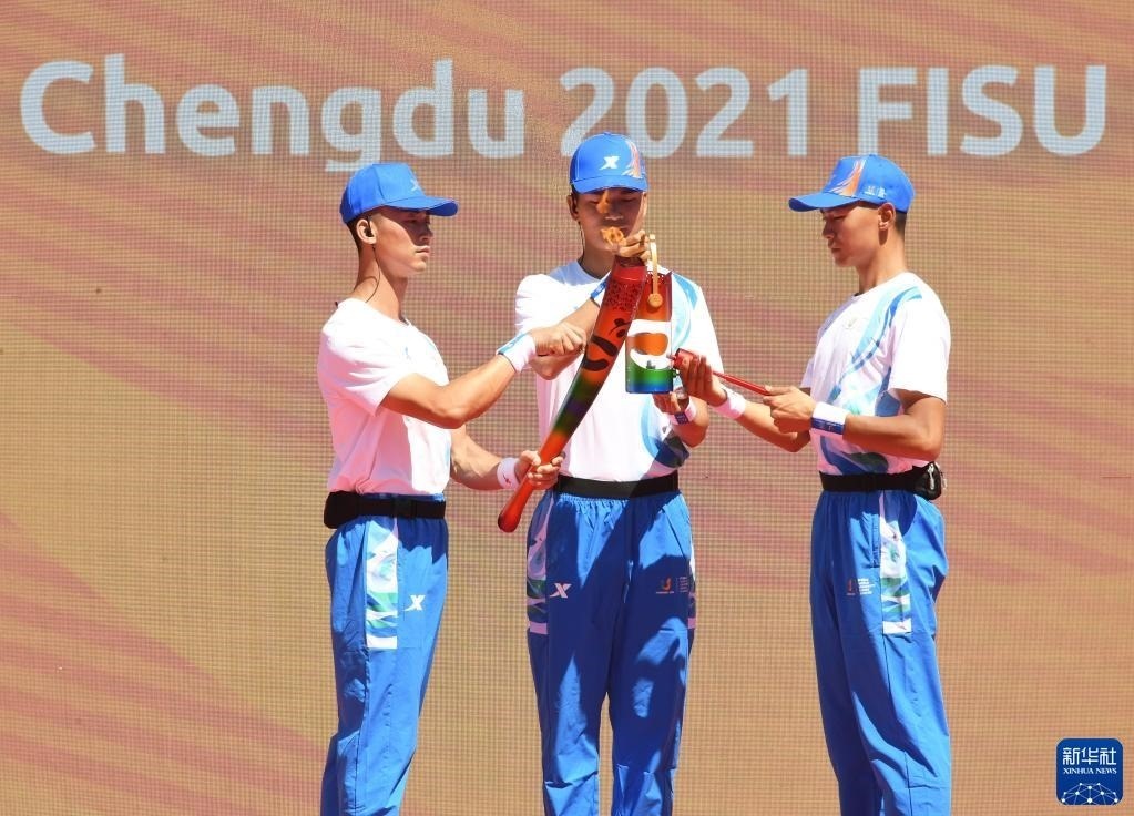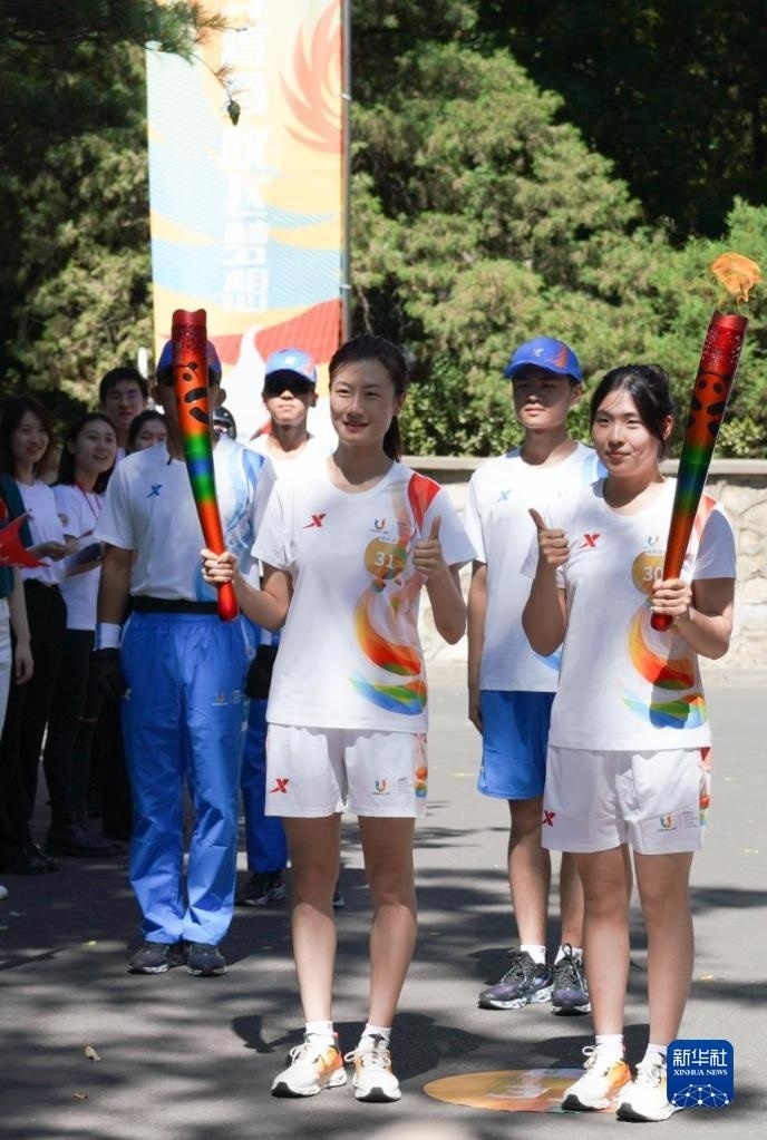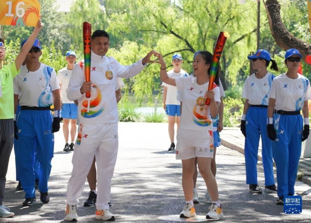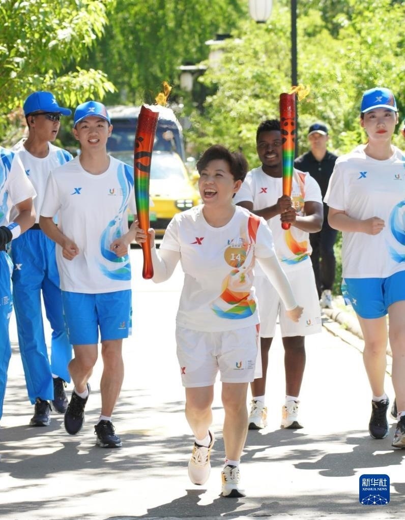 6月10日,火炬手丁寧(中)在火炬?zhèn)鬟f中。   新華社發(fā)(成都大運(yùn)會(huì)執(zhí)委會(huì)供圖)