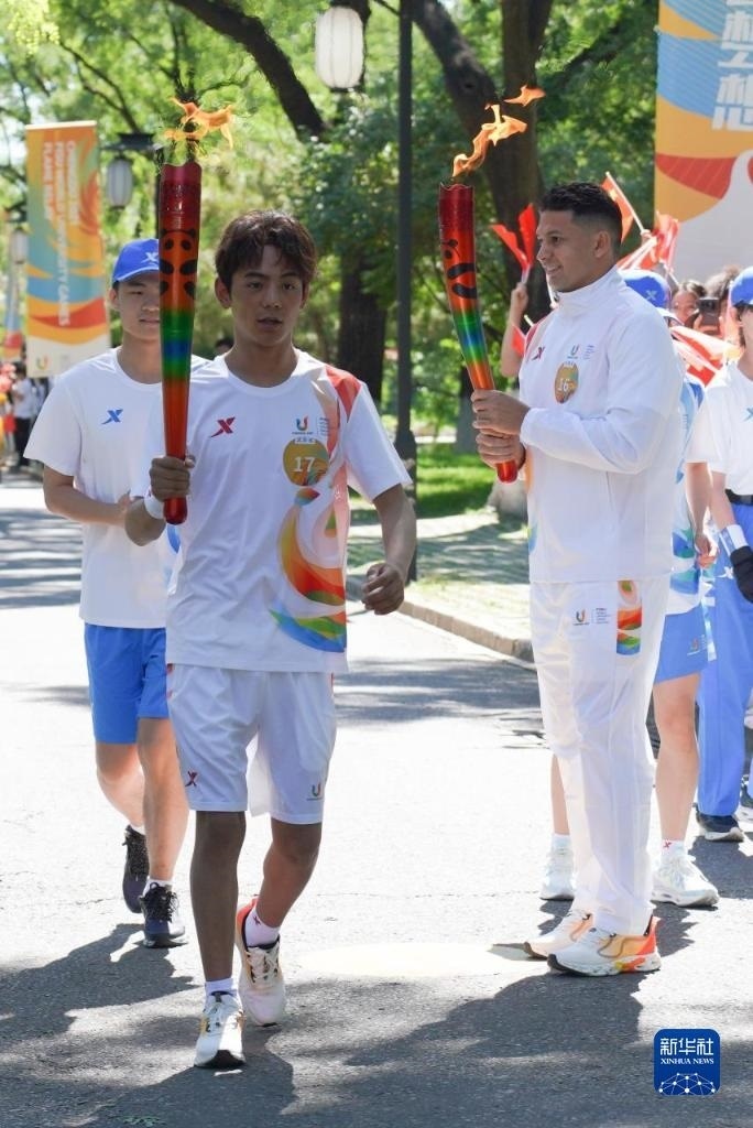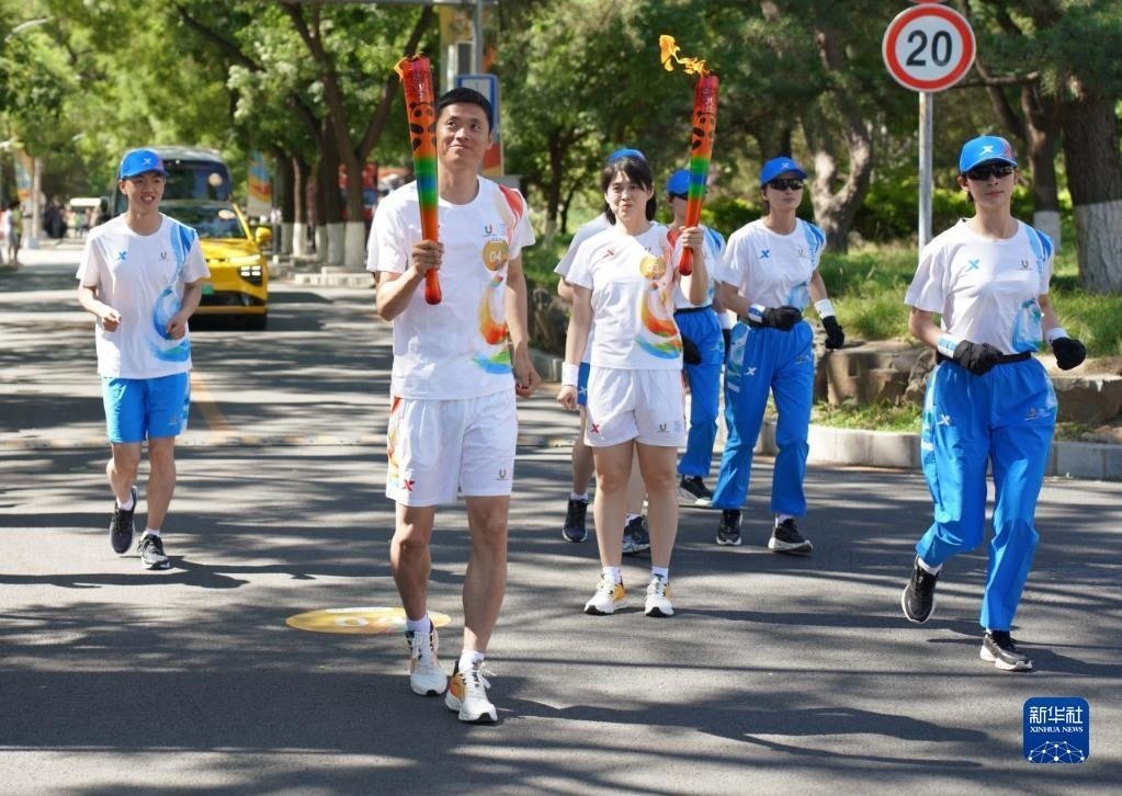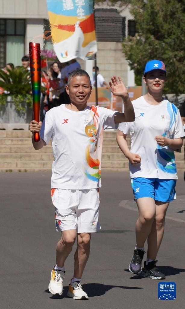 6月10日,火炬手邢衍安(左二)在火炬?zhèn)鬟f中。   新華社發(fā)(成都大運(yùn)會(huì)執(zhí)委會(huì)供圖)