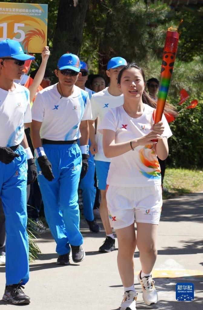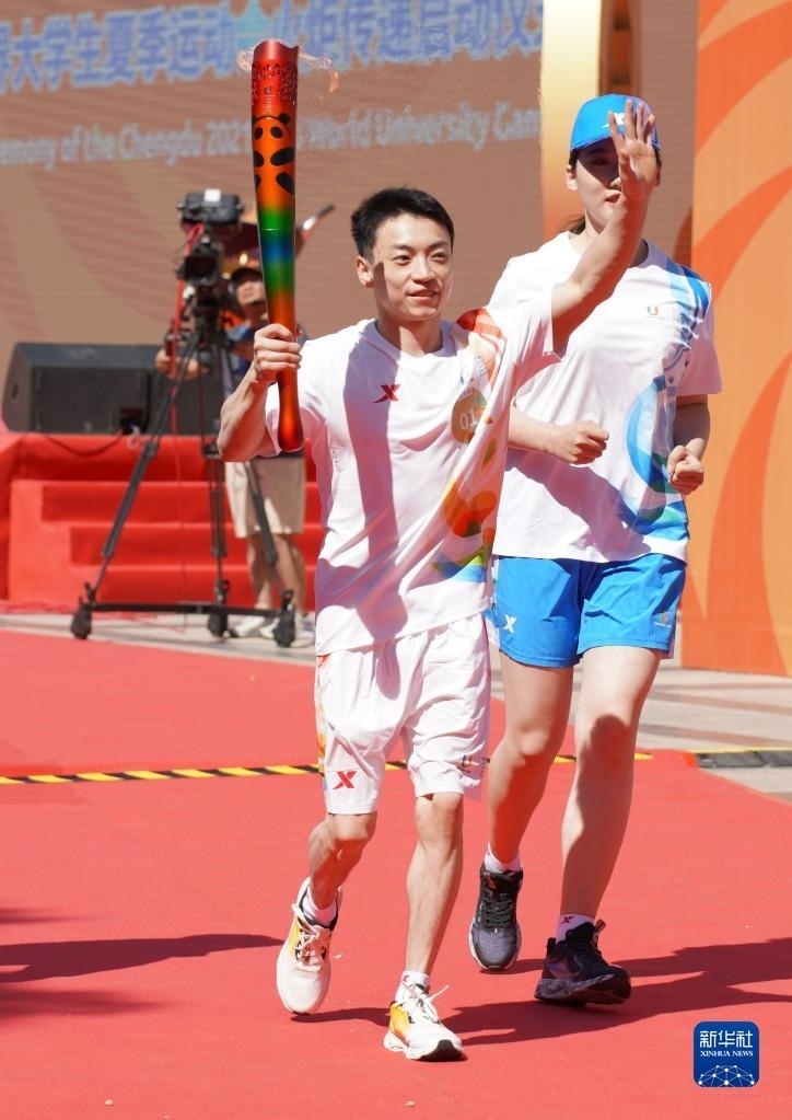 6月10日,火炬手楊凌在火炬?zhèn)鬟f中。   新華社發(fā)(成都大運(yùn)會(huì)執(zhí)委會(huì)供圖)
