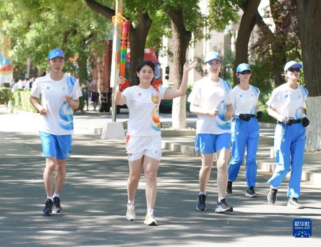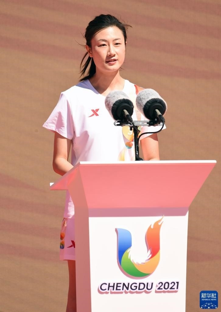 6月10日,火炬手楊倩在火炬?zhèn)鬟f中。   新華社發(fā)(成都大運(yùn)會(huì)執(zhí)委會(huì)供圖)