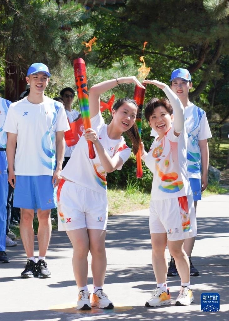 6月10日,火炬手楊倩(前左)與鄧亞萍在火炬?zhèn)鬟f中交接。   新華社發(fā)(成都大運(yùn)會(huì)執(zhí)委會(huì)供圖)