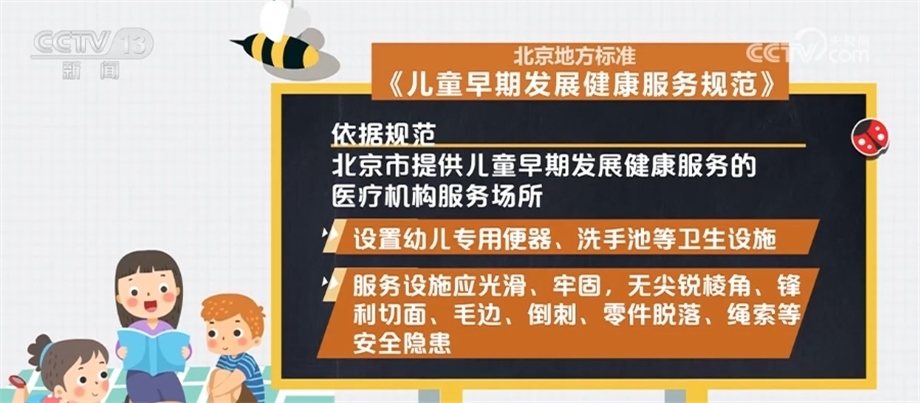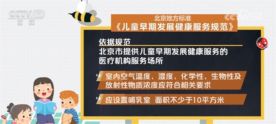 依據(jù)規(guī)范,北京市提供兒童早期發(fā)展健康服務的醫(yī)療機構服務場所應遠離各種污染源,采光充足,通風良好,遠離噪聲與電磁干擾;設置防蚊、蟲、蠅、鼠等設備,并放置于兒童無法接觸到的地方;室內空氣溫度、濕度、化學性、生物性及放射性物質濃度應符合相關要求。應設置哺乳室,面積不少于10平方米;設置幼兒專用便器、洗手池等衛(wèi)生設施;服務設施應光滑、牢固,無尖銳棱角、鋒利切面、毛邊、倒刺、零件脫落、繩索等安全隱患。