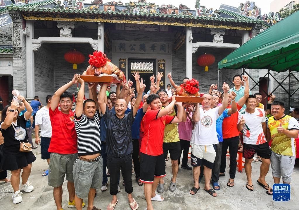 6月15日,2023年車陂龍舟競(jìng)渡第一名“范陽簡(jiǎn)”龍船會(huì)的成員們?cè)诩异羟疤е?jiǎng)品燒豬慶祝。