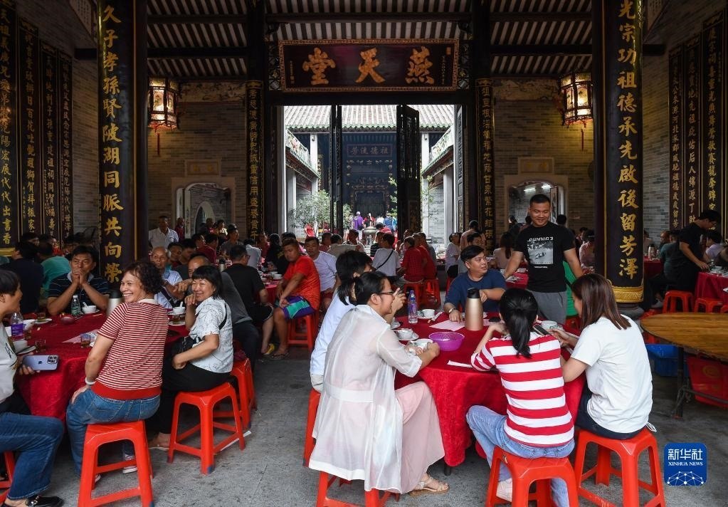 6月15日,2023年車陂龍舟競(jìng)渡第一名“范陽簡(jiǎn)”龍船會(huì)在簡(jiǎn)氏家祠里擺下幾十桌龍船飯慶祝。