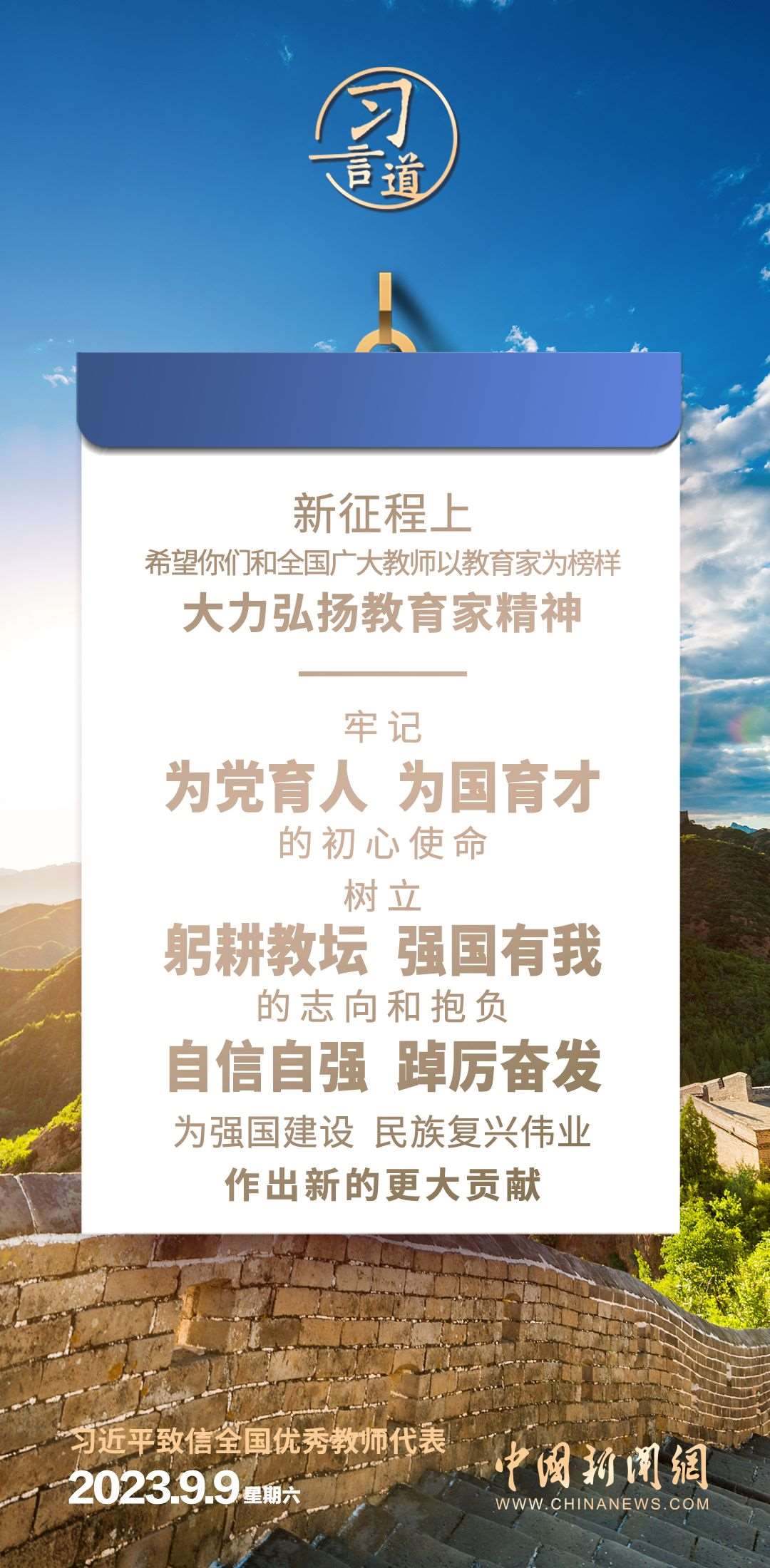 全國優(yōu)秀教師代表座談會9月9日在京召開。中共中央總書記、國家主席、中央軍委主席習近平致信與會教師代表,在第三十九個教師節(jié)到來之際,代表黨中央,向他們和全國廣大教師及教育工作者致以節(jié)日的問候和誠摯的祝福。習近平指出——