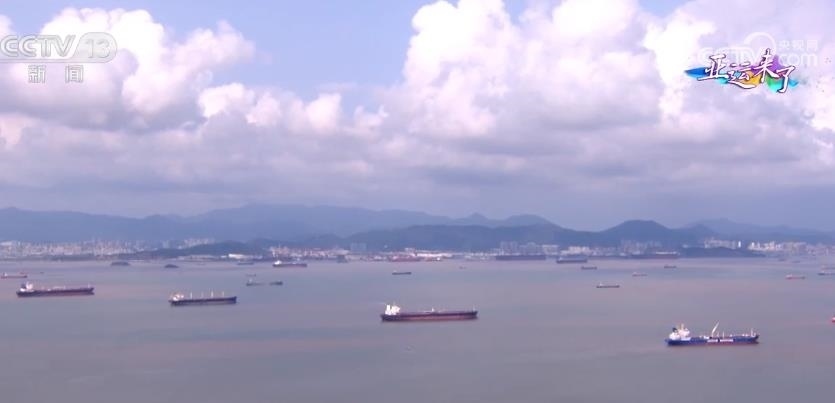 我們飛越兩座亞運場館,將要看到的就是寧波最閃亮的名片之一:寧波舟山港。繁忙是這座港口的常態(tài)。當我們的直升機遠遠地飛行,還沒有靠近港口的時候,就能先看到港口外的這片海域——洋小貓水域,這里是船舶經(jīng)南航道進出寧波舟山港核心港區(qū)的一條必經(jīng)之路。向下看,大家可以看到海面上星星點點的船只,來自全球各地滿載商品貨物的遠洋船舶在這里交匯。