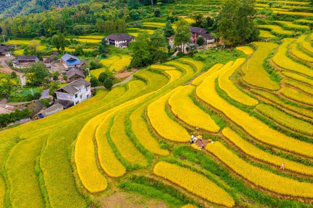↑2023年9月4日,湖南省東安縣舜皇山國家森林公園管理局塘家梯田,農(nóng)民在收割稻谷。CICPHOTO/嚴(yán)潔 攝