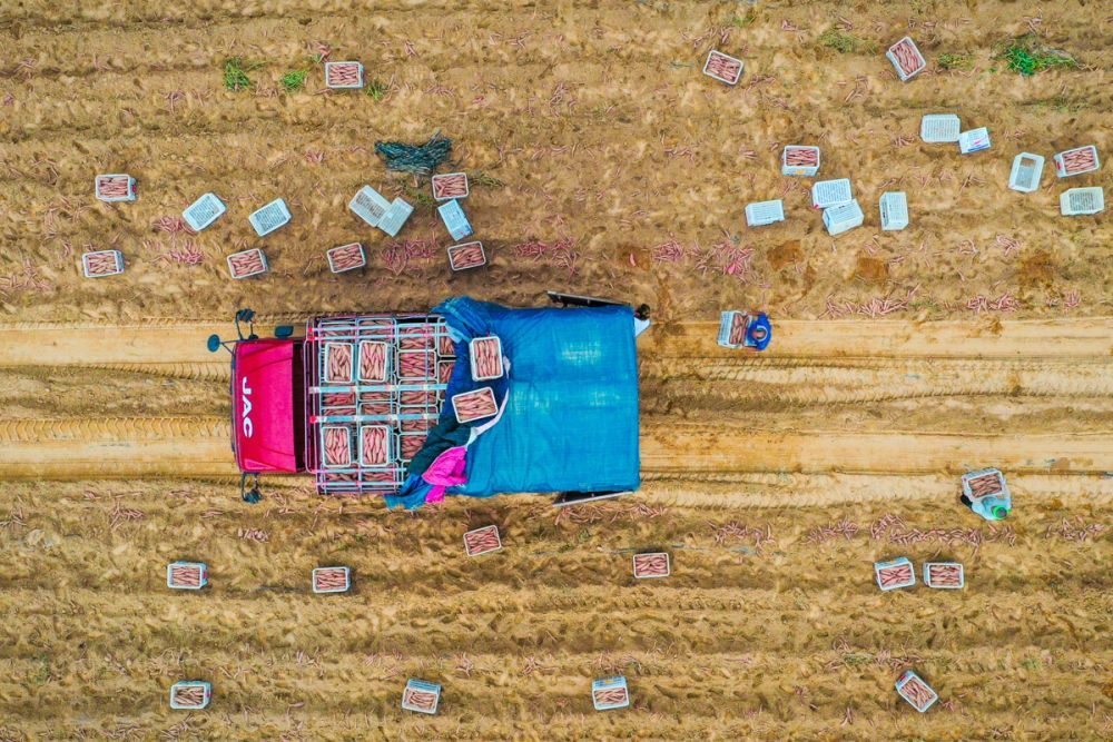 ↑2023年8月21日,河南省濮陽市清豐縣古城鄉(xiāng)齊家村,農(nóng)民在將采收的紅薯裝筐。CICPHOTO/紀(jì)全舉 攝