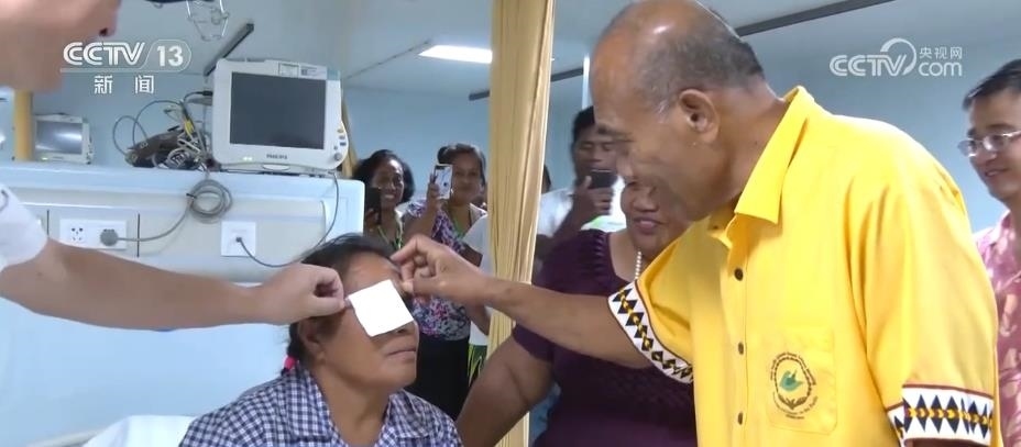 任務(wù)過程中,共有37名患者完成眼疾手術(shù)重見光明。這是一名受白內(nèi)障困擾接近10年的基里巴斯居民,聽到“和平方舟”能開展白內(nèi)障手術(shù)的消息,他在家人的陪伴下第一時間來到“和平方舟”眼科診室。中國醫(yī)生為其制定了全流程、精準化的診療方案,讓她重見光明。