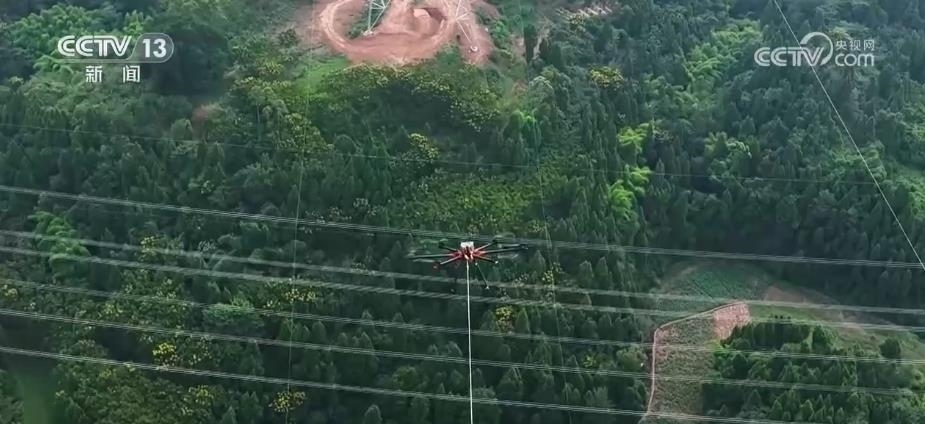 在施工現(xiàn)場(chǎng),工作人員操作無(wú)人機(jī),帶著牽引繩緩緩升空,在140米的高空,帶動(dòng)重量達(dá)到6噸的導(dǎo)線,緩緩跨過(guò)500千伏嘉林線上空,最終架設(shè)在兩基170多米高、間距400米的鐵塔間。
