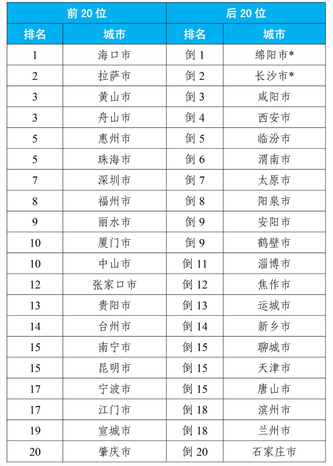 8月,168個重點城市中,空氣質(zhì)量排名前20位城市依次是拉薩、珠海和海口等城市(從第1名至并列第19名);空氣質(zhì)量排名后20位城市依次是太原、晉城和陽泉等城市(從倒數(shù)第1名至并列倒數(shù)第20名)。見附表1。