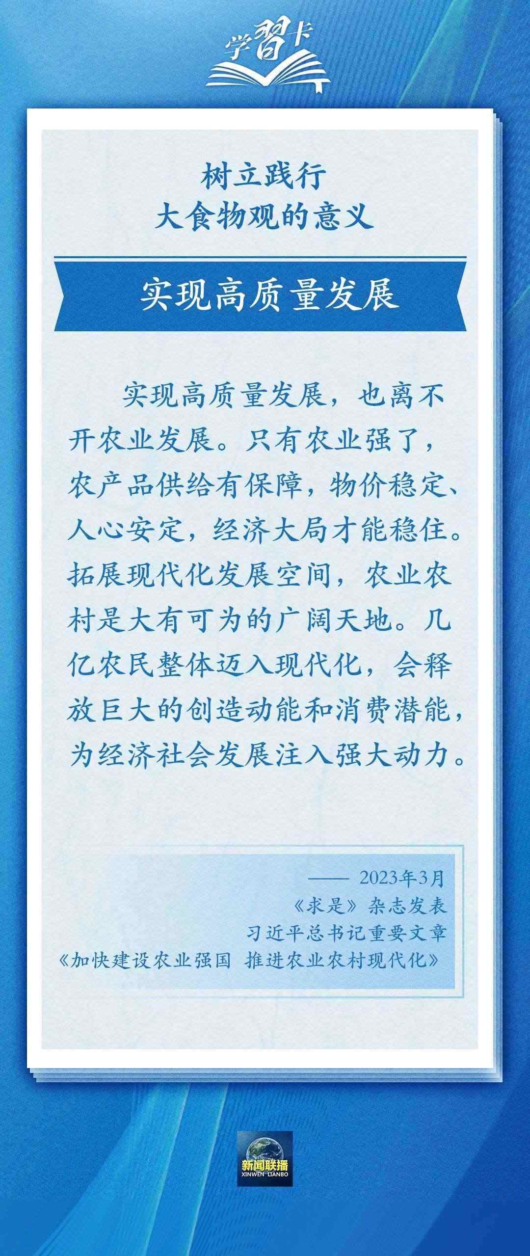 今年4月,總書記在廣東湛江考察時指出,要樹立大食物觀,既向陸地要食物,也向海洋要食物。前不久,總書記主持召開新時代推動?xùn)|北全面振興座談會強調(diào),踐行大食物觀,把農(nóng)業(yè)建成大產(chǎn)業(yè)。