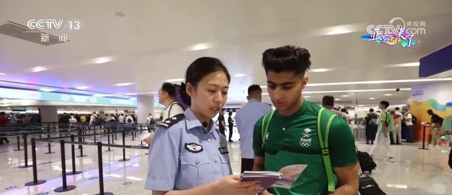 記者看到,在杭州機場口岸入境現(xiàn)場,杭州邊檢站設置了中英文對照的亞運會通關指示標識。配備了具備泰語、韓語、日語、阿拉伯語等多語種能力的檢查員,并在現(xiàn)場向入境的運動員發(fā)放、介紹亞運會服務指南。