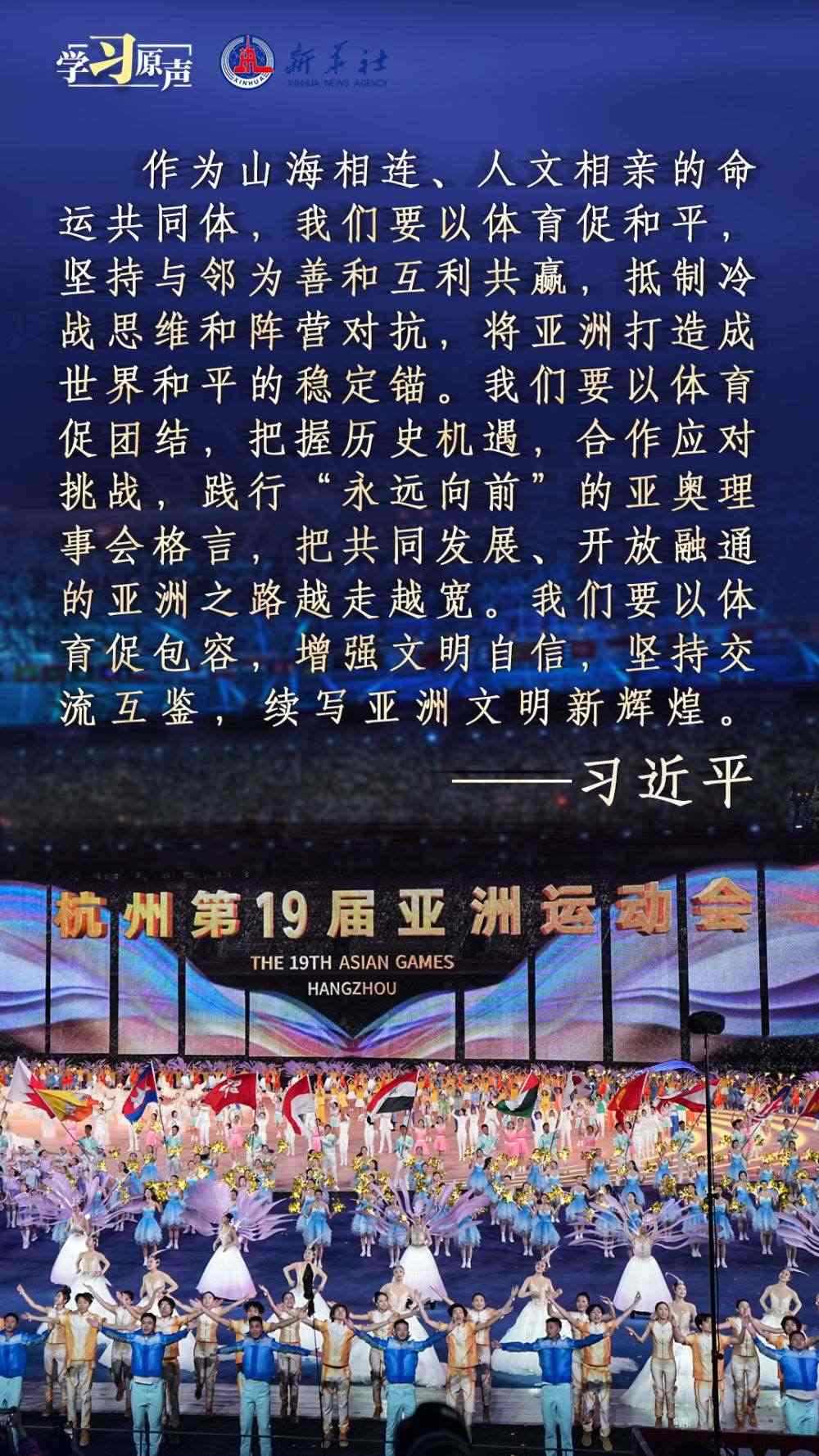 秋分時節(jié),舉世矚目的杭州第十九屆亞洲運動會隆重開幕?!皝喼捱\動會承載著亞洲人民對和平、團結(jié)、包容的美好向往?!绷暯街飨诤贾莸谑艑脕喼捱\動會開幕式歡迎宴會上的致辭,傳遞著熱情友好的情誼,宣示了新時代中國推動亞洲大家庭團結(jié)合作的堅定決心,為促進亞洲和國際奧林匹克運動發(fā)展、共建亞洲命運共同體注入強大信心與力量。