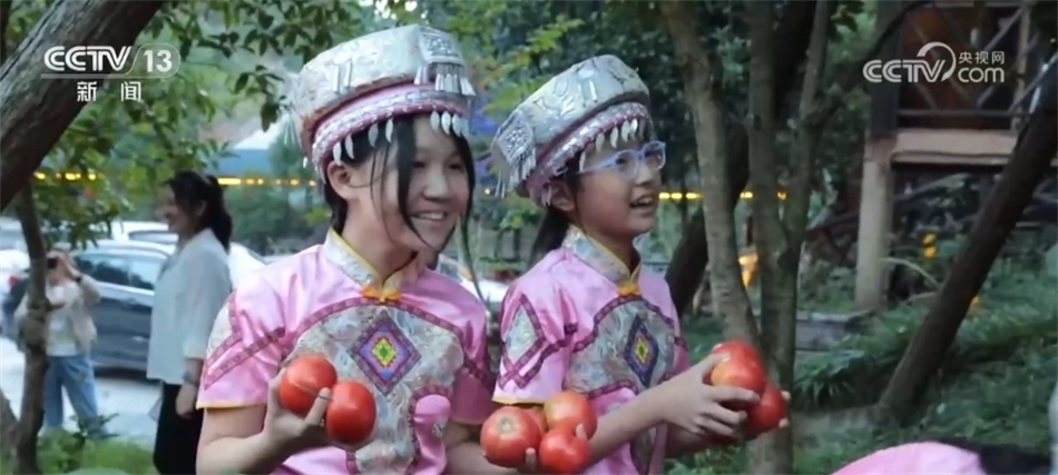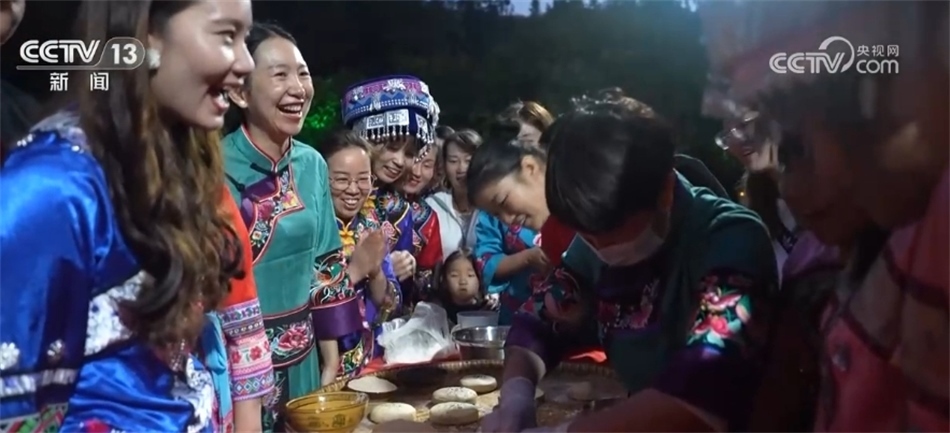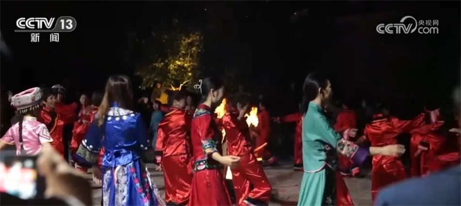 隨著歡快的音樂響起,當?shù)卮迕翊┥仙术r艷的節(jié)日盛裝,踏著鼓點,圍著篝火跳起土家擺手舞,豐收的喜悅洋溢在村民們的臉上,游客們加入其中,大家手牽著手,共同舞出金秋和美鄉(xiāng)村新畫卷。