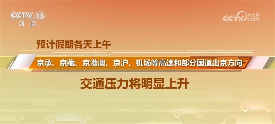 北京市交通部門表示,“雙節(jié)”假日期間,高速公路小客車免費通行、尾號不限行等措施帶動群眾出行需求集中釋放,預計中超、中網(wǎng)、演出等大型活動舉辦場地周邊道路短時車流集中,連接城區(qū)和郊區(qū)的各條高速公路將出現(xiàn)上午出京、下午進京的車流高峰,預計假期各天上午,京承、京藏、京港澳、京滬、機場等高速和部分國道出京方向的交通壓力將明顯上升。
