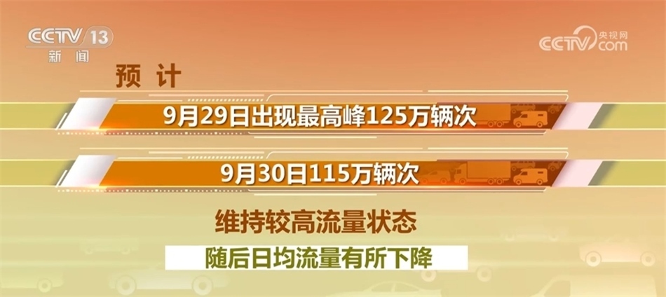 預計假期第一天,也就是今天(9月29日)出現(xiàn)最高峰125萬輛次,明天115萬輛次,維持較高流量狀態(tài),隨后日均流量有所下降。假期第七日和第八日路網(wǎng)流量將再度上升,且下午16時至19時易出現(xiàn)返程車流高峰。